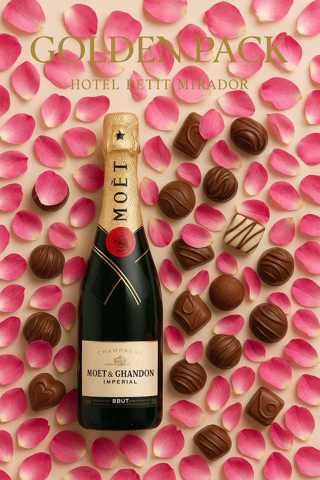 Golden Pack – 79,90 € Celebra el momento con una botella de Moët & Chandon y una selección de bombones , presentados con elegancia para una experiencia única en el Hotel Petit Mirador.